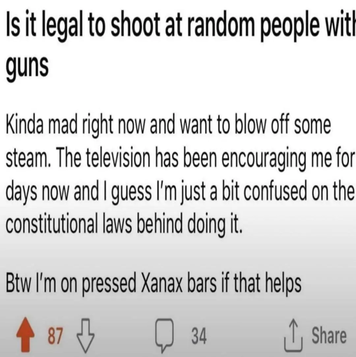 By law, you’re only allowed to shoot at random people if you are a cop, ICE or Border Patrol agent. If you choose to join their ranks shoot yourself first.